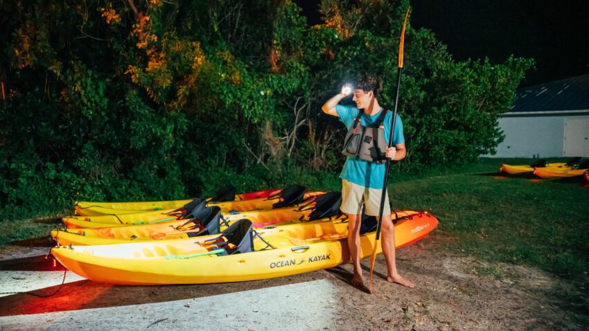 Man in blue shirt holding a paddle and a flashlight on a Fin Expeditions kayak tour