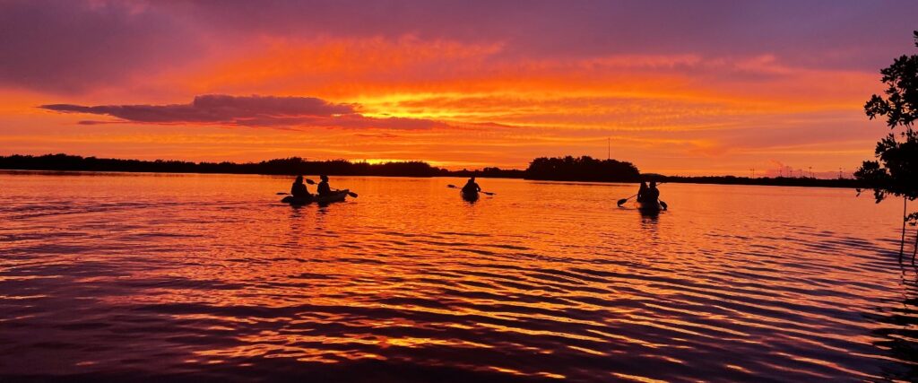 Man in blue shirt holding a paddle and a flashlight on a Fin Expeditions kayak tour